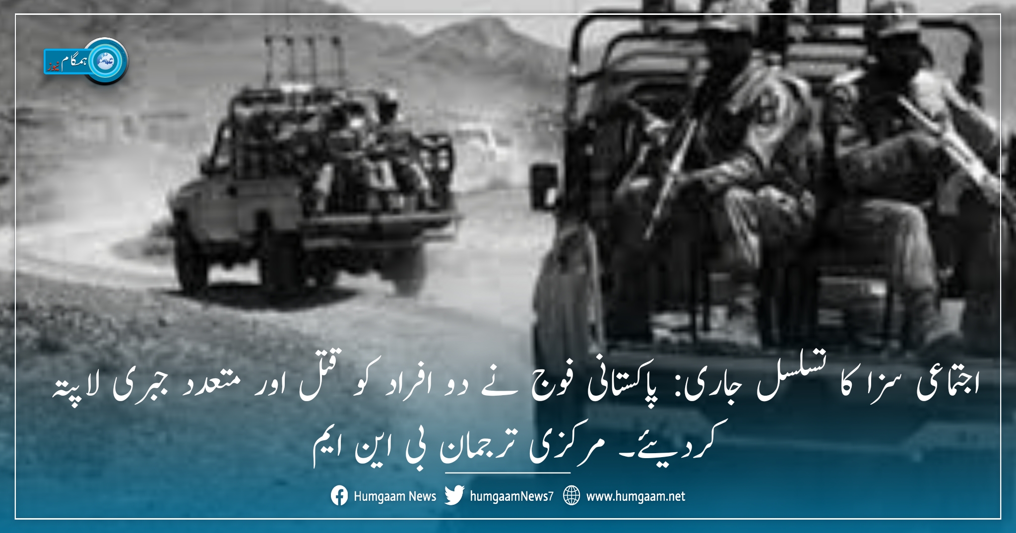 کوئٹہ (ہمگام نیوز) بلوچ نیشنل موومنٹ کے ترجمان نے کہا ہے کہ بلوچستان کے طول و عرض میں پاکستانی فوج کی بربریت جاری ہے اور لوگوں کو اجتماعی سزا کا نشانہ بنایا جا رہا ہے۔