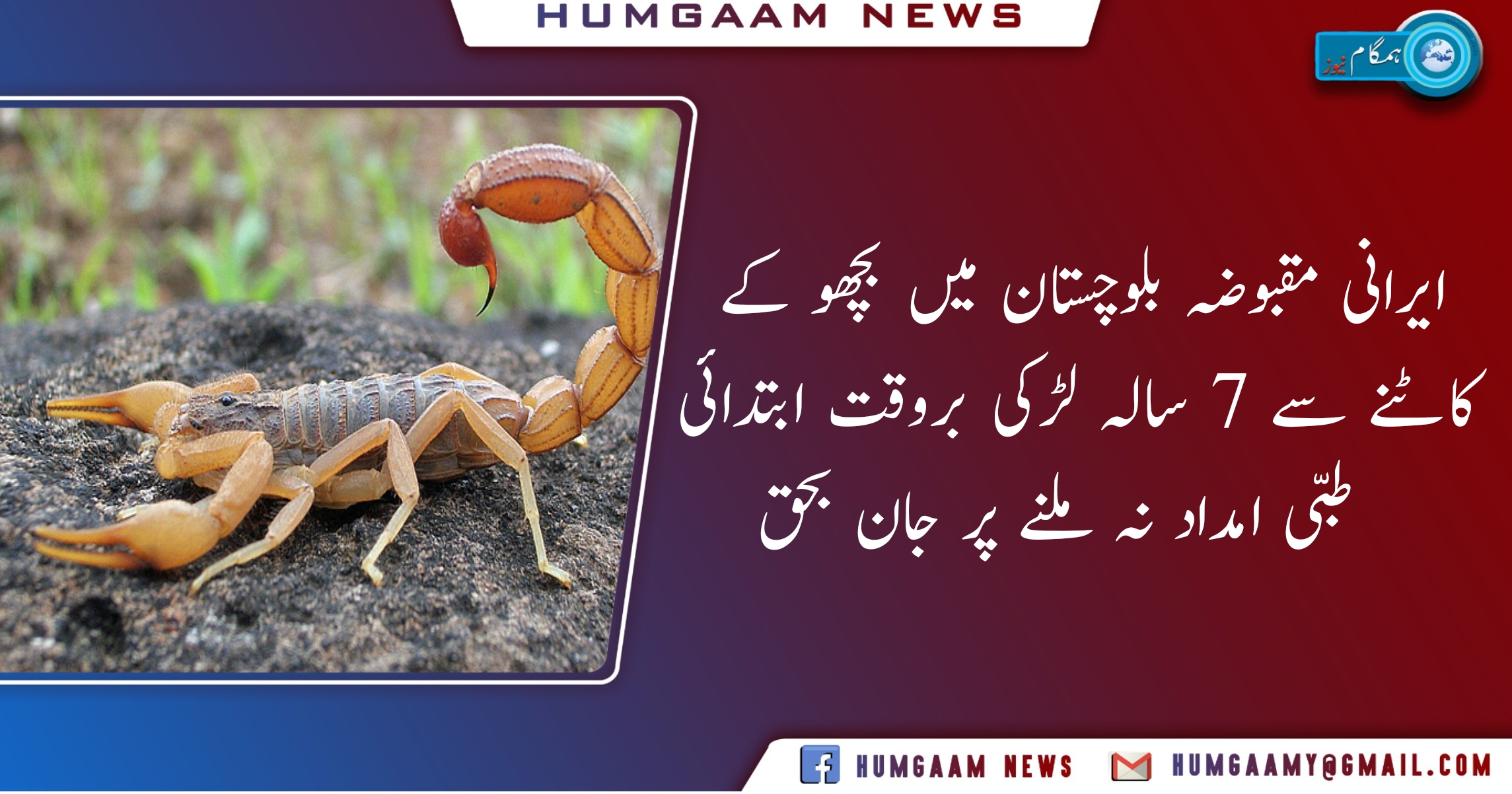 تفصیلات کے مطابق گذشتہ صبح سات سالہ بچی رباب کو بچھو نے کاٹا تھا، والدین بچی کو علاج کے لیئے ہرمزگان کے شہر میناب سٹی ہسپتال لے گئے تاہم دیہی علاقوں میں کچھی سڑکوں پر مسلسل موٹر سائیکل پر 8 گھنٹے کے سفر کے بعد ہسپتال پہنچے لیکن ہسپتال میں بروقت طبی سہولیات نہ ملنے پر سات سالہ بچی رباب دم تھوڑ گئی۔