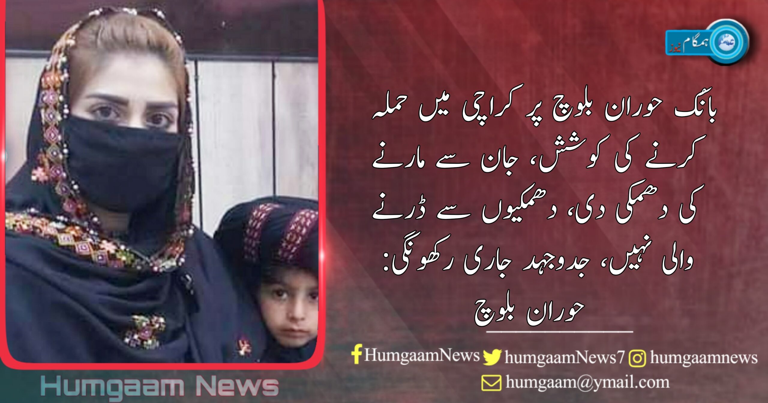 کراچی (ہمگام نیوز) بلوچ خاتون سیاسی اور انسانی حقوق کے لئے سرگرم کارکن بانُک حوران بلوچ پر کراچی میں پاکستان کے ریاستی کارندوں کی جانب سے حملہ کرنے کی کوشش اور جان سے مارنے کی دھمکیاں دیں۔