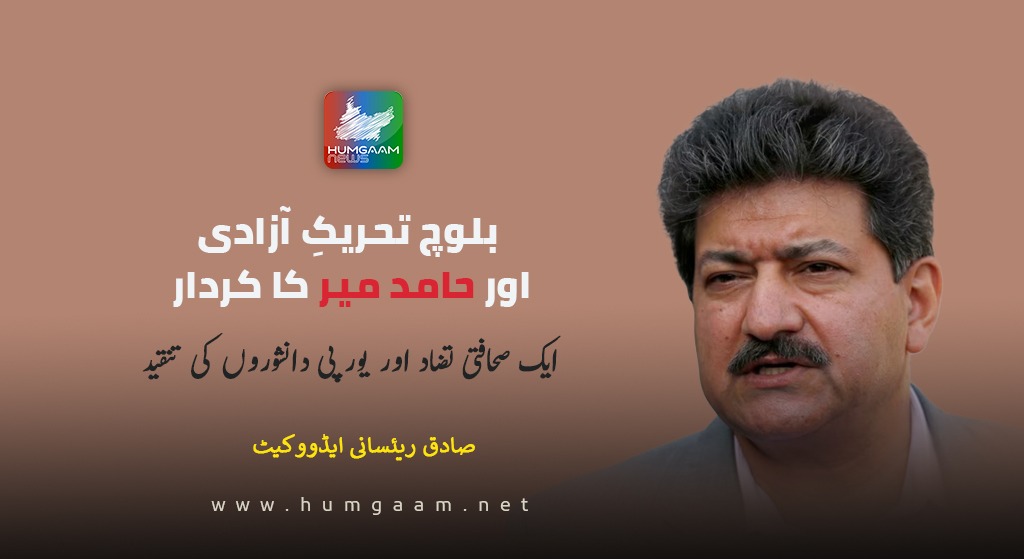 پاکستانی ریاستی میڈیا ہمیشہ سے بلوچ تحریکِ آزادی کو ایک “سازش” قرار دیتا آیا ہے۔ اسی ریاستی بیانیے کو صحافتی لبادہ پہنا کر بعض پاکستانی مشہور صحافی حامد میراسے عالمی سطح پر پیش کرتے رہے ہیں۔ بلوچ قوم دوست حلقوں میں حامد میر کو ایک ایسا چہرہ سمجھا جاتا ہے جو بظاہر انسانی حقوق اور جمہوریت کی بات کرتا ہے، مگر درپردہ پاکستانی و ایرانی ریاستی مفادات کا محافظ ہے۔