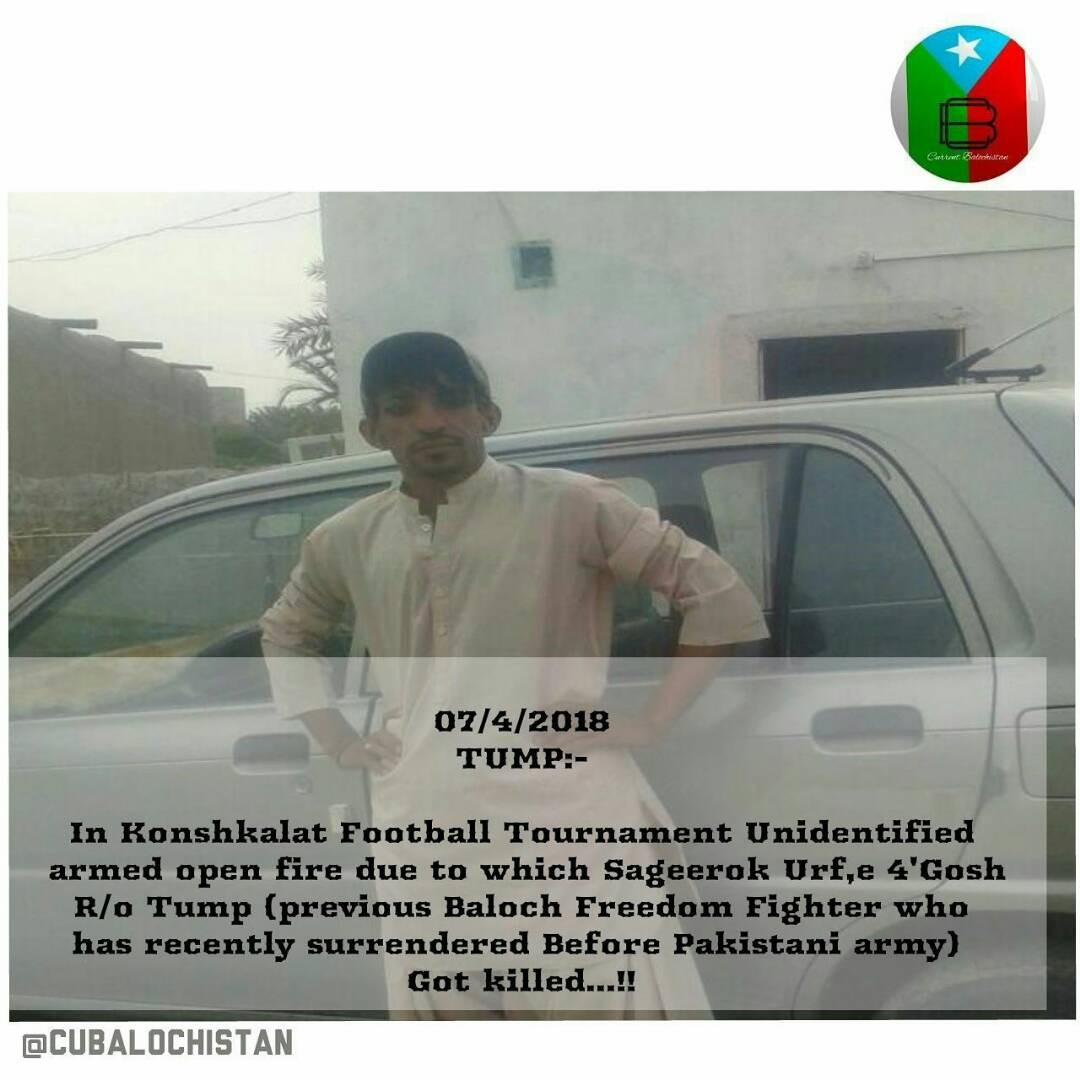تربت (ہمگام نیوز) تمپ میں نامعلوم افراد کی فائرنگ سے صغیروک عرف گوش ہلاک اطلاعات کے مطابق تمپ کے علاقے کوشقلات میں فٹبال ٹورنمنٹ میں نامعلوم موٹر سائیکل سواروں نے گروئد کو گھیرے میں لیکر سرینڈر شدہ صغیروک عرف چارگہوش کو فائرنگ کرکے ہلاک کر دیا زرائع کے مطابق صغیروککچھ وقت پہلے ہی تمپ ایف سی کیمپ میں ہتھیار پھینک کر سرینڈر ہوچکا تھا ،
