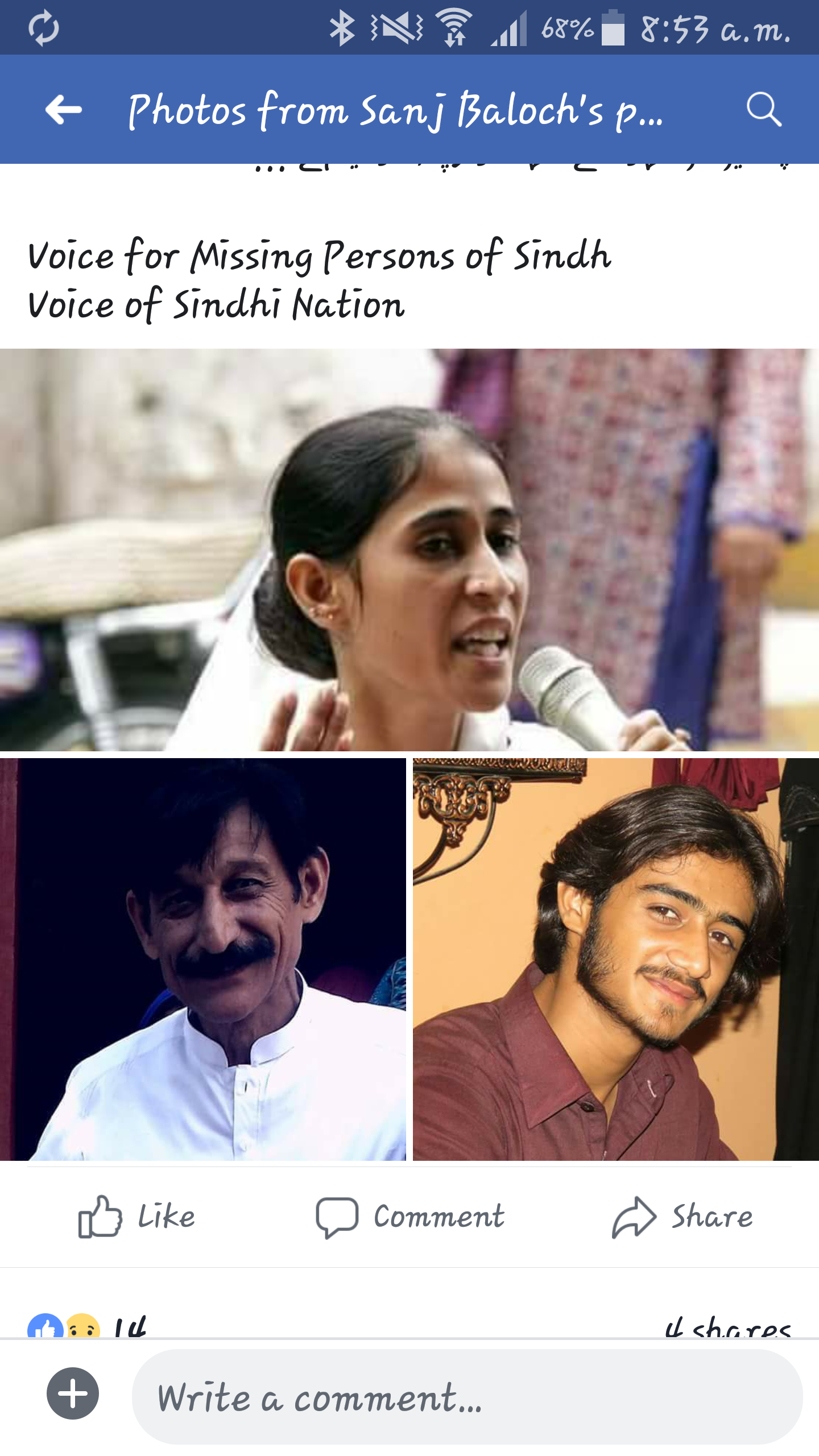 جبکہ اس حوالے سندھ وائس فار مسنگ پرسنز آف سندھ کی ڈپٹی کنوینر سندھو امان چانڈیوں نے کہا کہ رات کے 1 بجہ قریب سندھ پولیس موبائل اور ایک وائٹ کلر کی لینڈ کرور جس کانمبر 46BF 9040 تھا اس میں سوار سول ڈریسز میں اہلکار میرے بابا امان اللہ ، چھوٹے بھائی صفی اللہ اور میرے کزن گلشن کو جبری طور پر حراست میں لیکر اپنے ساتھ لے گئے ۔