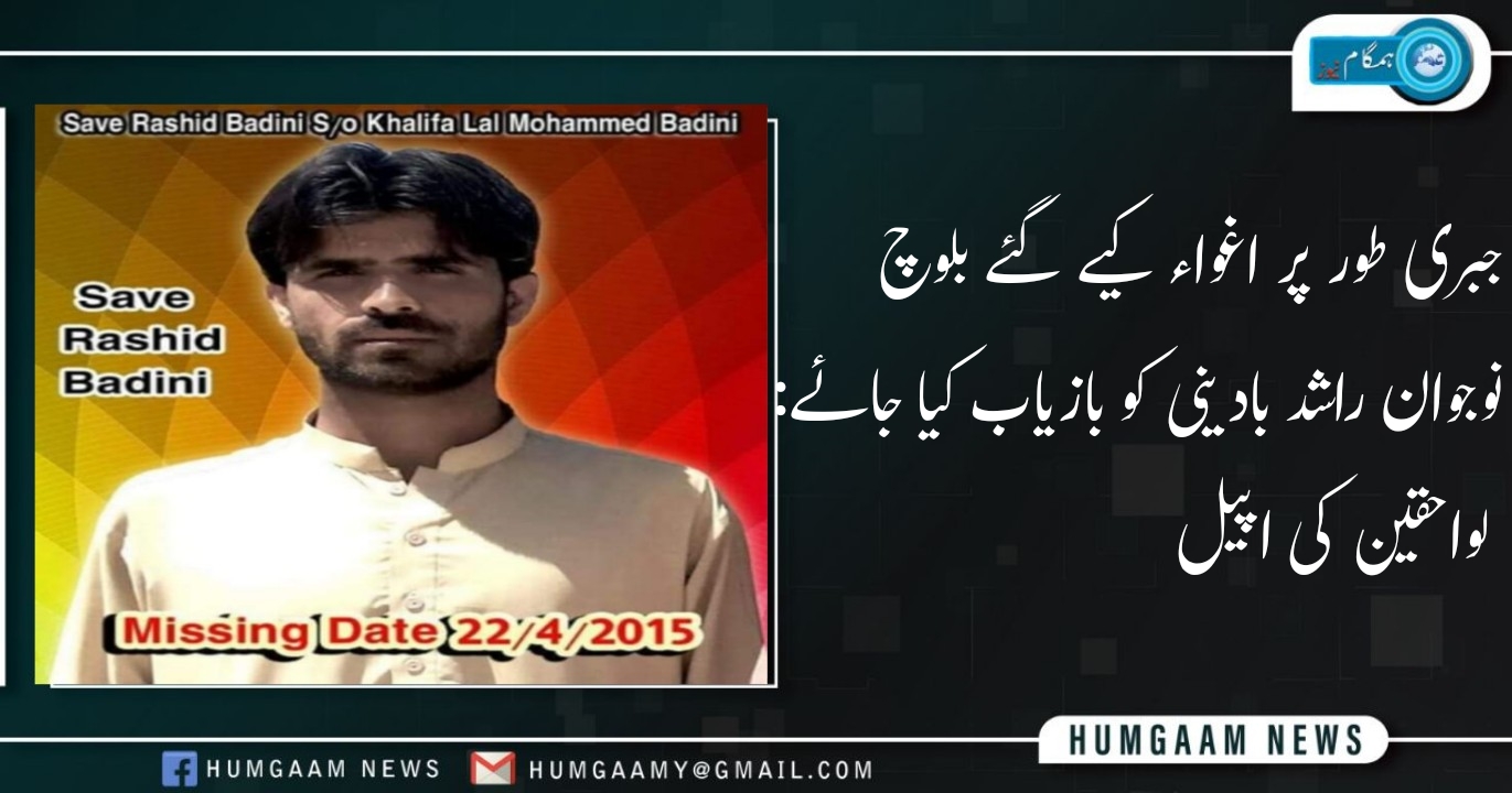 جبری طور پر اغواء کیے گئے بلوچ نوجوان راشد بادینی کو بازیاب کیا جائے: لواحقین کی اپیل