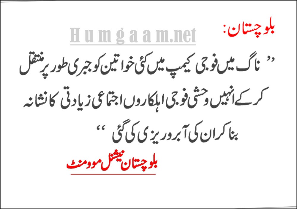 انہوں نے کہا کہ گزشتہ دنوں ضلع واشک میں ناگ رخشان کے فوجی کیمپ میں کئی خواتین کو جبری طورپر منتقل کرکے انہیں وحشی فوجی اہلکاروں نے اجتماعی زیادتی کا نشانہ بناکران کی آبروریزی کی گئی لیکن ان کی دلدوزچیخیں خاموش میڈیا اور عالمی اداروں تک نہیں پہنچ سکتے کیونکہ بلوچستان عالمی میڈیاکی عدم رسائی اور پاکستان میڈیاکے بائیکاٹ کی وجہ سے ایک بلیک ہول بن چکاہے جہاں پاکستان کی جنگی جرائم اور وحشیانہ اقدامات مظلوموں کی آہوں اور چیخ و پکار کے ساتھ دفن ہورہے ہیں لیکن تاریخ کے صفحات میں ضرور درج ہوں گے اور ایک دن پاکستانی ریاست ،پاکستان کے ہمنوا پارلیمانی پارٹیوں اور خاموش مگر ذمہ دار انسانی حقوق کے اداروں کو بلوچ قوم کے ساتھ روا رکھے جانے والے مظالم کا حساب دینا ہوگا۔