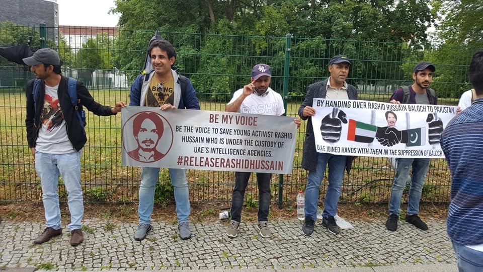 مظاہرین نے کہا کہ راشد حسین معروف بلوچ سوشل میڈیا ایکٹوسٹ اور انسانی حقوق کے سرگرم رکن تھے ۔راشد حسین کا فیملی پاکستانی جبر کا شکار ہوا اور اسکا ایک چچا اور دو کزن پاکستانی فوج اور مذہبی دہشت گردوں کے ہاتھوں اغوا کے بعد قتل ہوچکے ہیں ۔راشد حسین اپنے زندگی کو بچانے کے لیے متحدہ عرب امارات منتقل ہوچکے تھے اور وہاں محنت مزدوری کے علاوہ بلوچستان  میں انسانی حقوق کے خلاف ورزیوں پر سوشل میڈیا میں ایک منظم طریقے سے آواز اٹھا رہے تھے لیکن پاکستان فوج اور آئی ایس آئی کو یہ عمل ناگوار گزرا اور اس نے متحدہ عرب امارات خفیہ اداروں کے ہاتھوں راشد حسین کو 26 دسمبر 2018 کو راہ چلتے شارجہ سے اغوا کرایا اور 6 مہینوں تک اذیت خانوں میں رکھا اور 22 جون کو غیر قانونی طور پر پر اسے ایک پرائیوٹ طیارہ کے ذریعے بلوچستان منتقل کرکے پاکستانی فوج کے حوالہ کیا گیا اور 3 جولائی کو پاکستانی میڈیا میں یہ خبر بریک کیا گیا کہ راشد حسین کو انٹرپول کے ذریعے پاکستان کے حوالے کیا گیا ہے جو جھوٹ ہے ۔