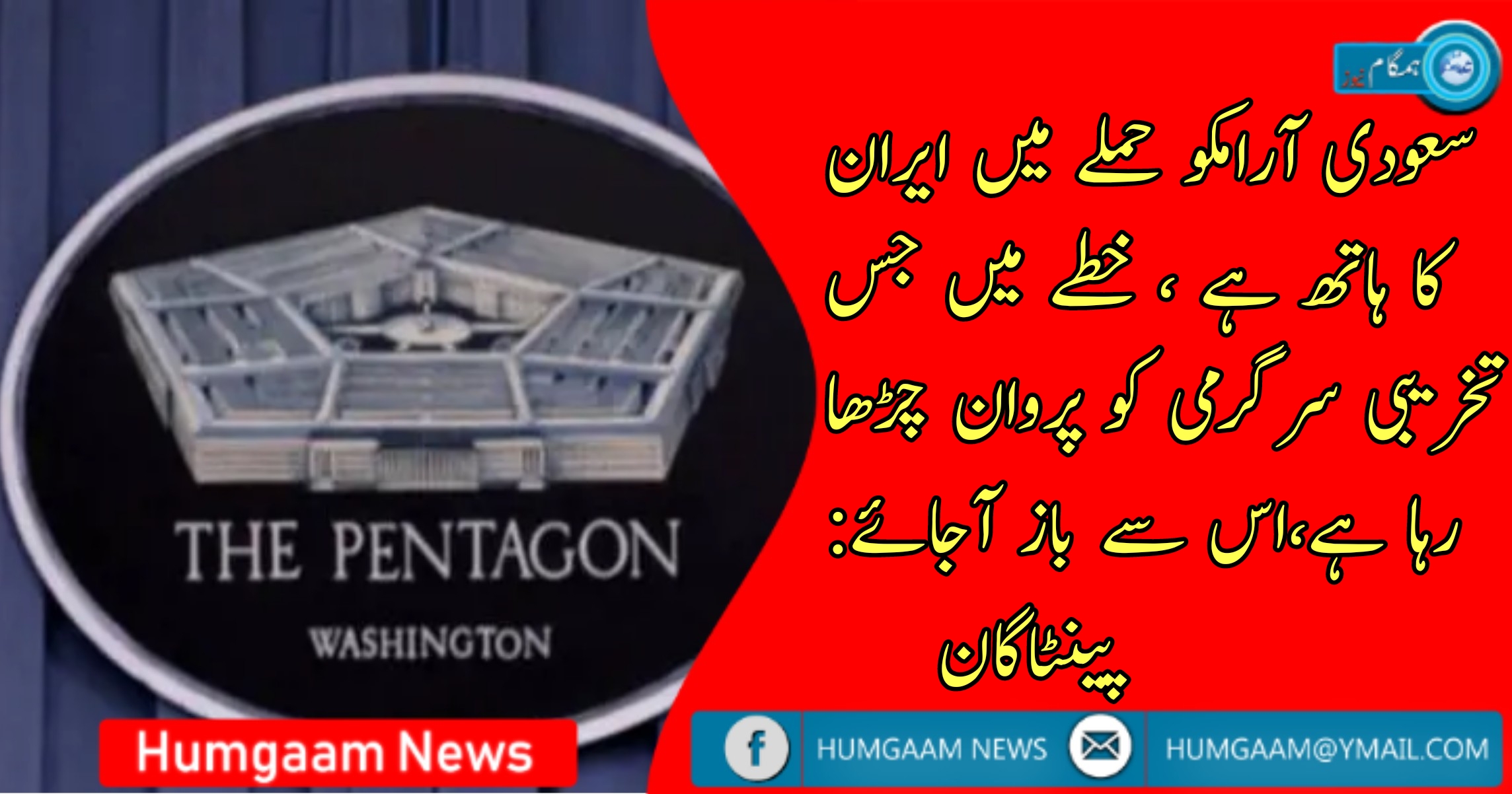 سعودی آرامکو حملے میں ایران کا ہاتھ ہے،خطے میں جس تخریبی سرگرمی کو پروان چڑھا رہا ہے،اس سے باز آجائے: پینٹاگان