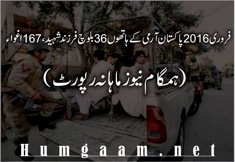 (ادارہ)فروری 2016پاکستان آرمی کے ہاتھوں 36بلوچ فرزند شہید، 167اغواء