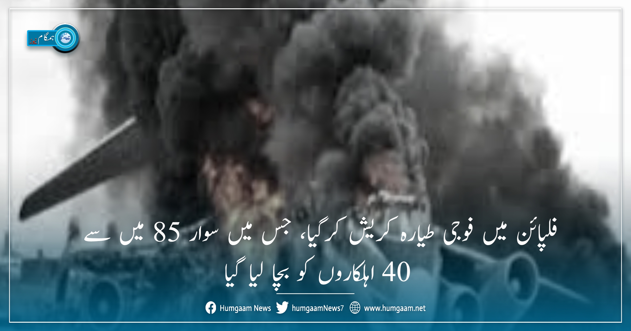 منیلا (ہمگام نیوز) مانیٹرنگ نیوز ڈیسک رپورٹس کے مطابق فلپائن کے جنوبی حصے میں ایک فوجی طیارہ گر کر تباہ ہو گیا، جس میں کل 85 افراد سوار تھے ان میں 40 افراد کع بچا لیا گیا ہے جبکہ باقیوں کی تلاش ابھی تک جاری ہے۔