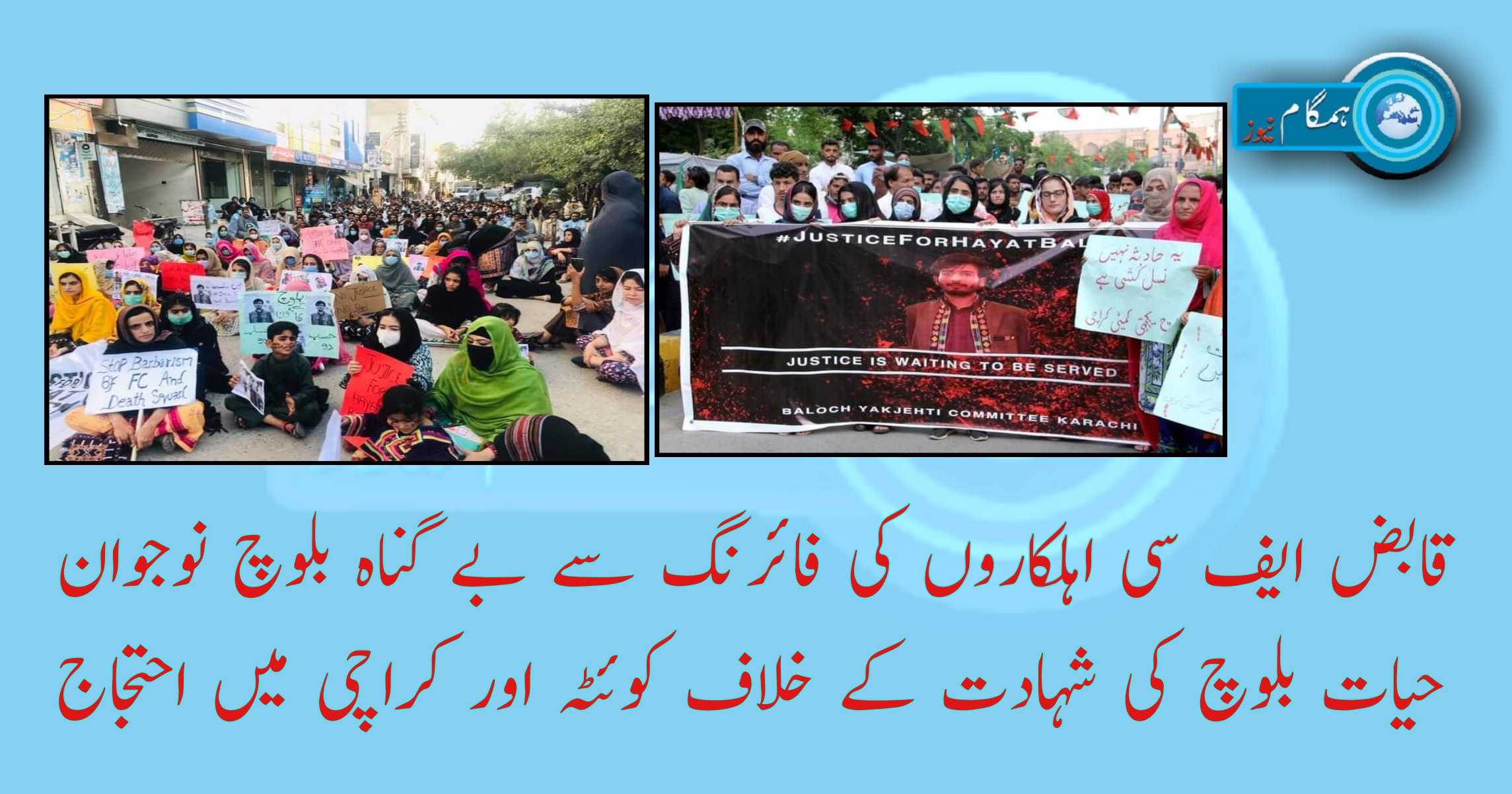 مظاہرہ کوئٹہ اور کراچی پریس کلب کے سامنے منعقد کئے گئے۔ مظاہرین سے خطاب کے دوران مقررین نے ایف سی اہلکار کے ہاتھوں بے گناہ نوجوان حیات بلوچ کو شہید کئے جانے کی شدید الفاظ میں مذمت کی۔