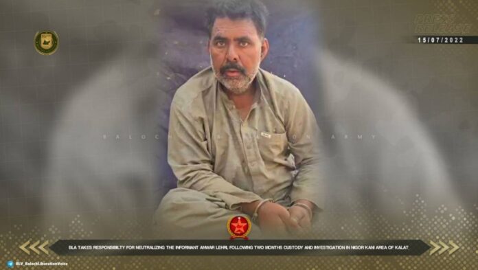 قلات میں دو ماہ سے زیر حراست مخبر انور لہڑی کو جرم کی توثیق کے بعد فائرنگ کرکے انجام تک پہنچا دیا۔ بی ایل اے