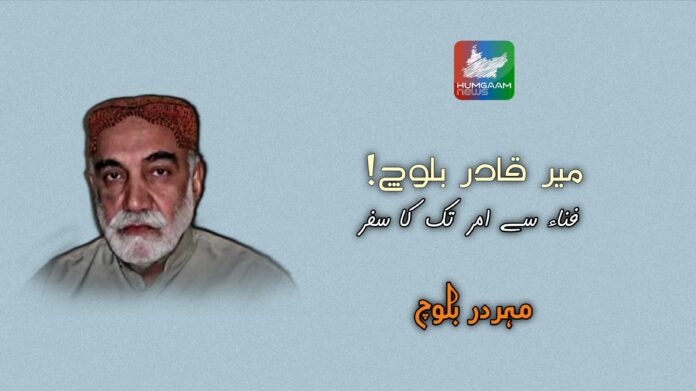 تاریخ کے دامن میں وہی نام ہمیشہ کے لیے محفوظ رہتے ہیں جو اپنے وجود کو ذاتی مفادات، وقتی آسائشوں اور فانی جسمانی زندگی سے بلند کر کے ایک نظریہ میں ڈھال لیتے ہیں۔ افراد مٹ جاتے ہیں، سلطنتیں ٹوٹ جاتی ہیں، طاقتور زوال پذیر ہو جاتے ہیں، لیکن نظریات وقت کے ہر طوفان کو شکست دیتے ہوئے نسل در نسل اپنی روشنی کو منتقل کرتے رہتے ہیں۔ میر قادر انہی ہستیوں میں شامل ہیں جنہوں نے اپنی ذات کو محض ایک انسان کی حد تک محدود نہ رہنے دیا بلکہ اپنے کردار، قربانی اور جدوجہد کے ذریعے ایک ایسے نظریے کا روپ دھارا جو غلامی کے اندھیروں میں روشنی کی کرن ہے۔ اسی لیے کہا جا سکتا ہے کہ وہ فنا نہیں ہوئے، کیونکہ نظریات مر نہیں سکتے۔ وہ امر ہو گئے ہیں۔فنا محض جسمانی موت کا نام نہیں، بلکہ یہ اس وقت آتی ہے جب ایک فرد یا قوم اپنے شعور، اپنی شناخت اور اپنے مقصد کو کھو بیٹھتی ہے۔ جب کوئی انسان اپنی زندگی کو صرف ذاتی آسائشوں اور وقتی خواہشات کے گرد محدود کر دیتا ہے، تو وہ زندہ ہوتے ہوئے بھی مر چکا ہوتا ہے۔ اس کے برعکس، امر ہونا اس وقت ممکن ہوتا ہے جب کوئی فرد اپنے وجود کو ایک ایسے نظریے میں ڈھال دیتا ہے جو وقت، مقام اور جسمانی فنا سے ماورا ہو۔وہ جانتے تھے کہ غلامی کے خلاف لڑنے والا ہر شخص طاقتور دشمنوں کے نشانے پر ہوتا ہے، لیکن انہوں نے موت کو ایک اختتام نہیں بلکہ آغاز سمجھا۔ ان کے لیے جسمانی فنا محض ایک مرحلہ تھا، کیونکہ وہ اپنی فکر اور جدوجہد کو اس مقام تک لے گئے جہاں سے واپسی ممکن نہیں۔