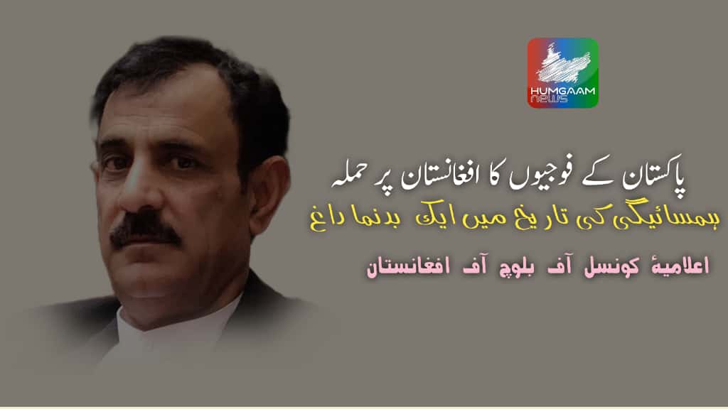شال ( ہمگام نیوز ) رئیس کونسل آف بلوچ آف افغانستان الحاج سینیٹر محمد نادر بلوچ نے جاری بیان میں کہاہے کہ پاکستان کے فوجیوں کا افغانستان پر حملہ، ہمسائیگی کی تاریخ میں ایک بدنما داغ ہے ۔
