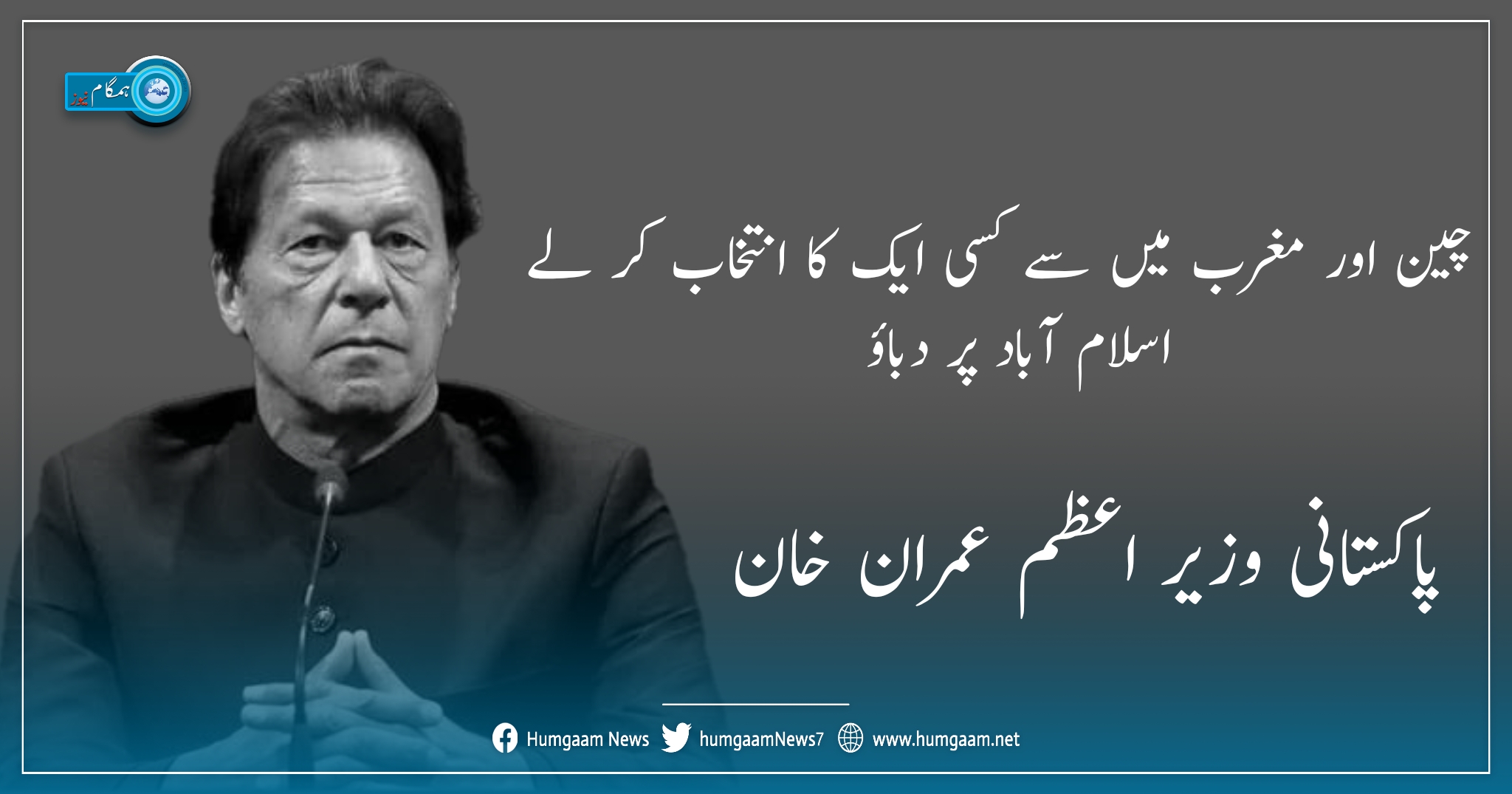 پاکستانی وزیر اعظم کا اس انٹرویو میں مزید کہنا تھا کہ خطے میں بڑی طاقتوں کے درمیان مخاصمت جاری ہے لیکن اسلام آباد پر یہ دباؤ نہیں ڈالا جا سکتا کہ وہ چین کے ساتھ اپنے تعلقات میں تبدیلی لائے۔ انہوں نے مزید کہا کہ مشکل کی ہر گھڑی میں چین ہمیشہ پاکستان کے ساتھ کھڑا رہا ہے۔