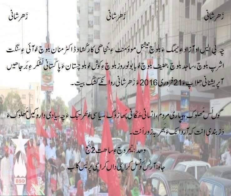 کوئٹہ (ہمگام نیوز)بلوچ اسٹوڈنٹس آرگنائزیشن آزاد کے مرکزی ترجمان نے ڈاکٹر منان بلوچ و ساتھیوں کو شہید کرنے اور بلوچستان میں جاری فوجی آپریشنوں کے خلاف فروری کی21تاریخ کو کراچی میں احتجاجی ریلی نکالنے کا اعلان کرتے ہوئے کہا کہ بلوچ سیاسی لیڈران و نہتے لوگوں کا قتل بلوچ عوام کی سیاسی آواز کو دبانے کی ریاستی پالیسیوں کا تسلسل ہے۔ترجمان نے کہا کہ ڈاکٹر منان بلوچ و ساتھیوں کی شہادت کو کٹھ پتلی حکومتی ذرائع کی جانب سے عظیم کامیابی قرار دینا سیاسی روایات کے منافی اور حیران کن ہے۔ کیوں کہ سیاسی لیڈران کو گھروں میں گھس کر نشانہ بنانا اور انہیں میڈیا میں مذاحمت کار ظاہر کرنا خود ریاست کی ان جھوٹی و من گھڑت دعوؤں کا عکّاس ہے جو کہ بلوچ مسئلے کی اہمیت و اصلیت کو چھپانے کے لئے ریاستی ادارے بارہا کرتے ہیں۔پاکستانی میڈیا سمیت بلوچستان کی حالات میں دلچسپی رکھنے والے تمام ادارے بخونی جانتے ہیں کہ ڈاکٹر منان بلوچستان کی ایک اہم سیاسی شخصیت تھے، جنہیں فورسز نے مقابلے کا جھوٹا دعویٰ کرکے شہید کیا تھا۔ڈاکٹر منان و دیگر سیاسی کارکن و لیڈران کی شہادت و اغواء سے ریاست دنیا کو یہ واضح پیغام دے رہی ہے کہ وہ اپنی طاقت کے بل بوتے پر مظلوم بلوچ قوم کے ساتھ کچھ بھی کرسکتا ہے۔ انہوں نے کہا کہ ڈاکٹر منان بلوچ کی شہادت پہلا واقعہ نہیں تھا بلکہ اس سے پہلے بھی رضا جہانگیر، شہید غلام محمد، و دیگر سیاسی لیڈران کی اغواء و شہادت اور زاہد بلوچ، زاکر مجید، ڈاکٹر دین محمد بلوچ سمیت دوسرے سیاسی لیڈران کی اغواء جیسے واقعات فورسز کے ہاتھوں رونما ہو چکے ہیں، ہر گزرتے دن کے ساتھ سیاسی کارکنوں و عوام کے لئے ریاستی طاقت کا استعمال شدید تر ہوتا جا رہا ہے۔ بی ایس او آزاد کے ترجمان نے کہا کہ بلوچستان کے علاقوں، آواران، کولواہ، مشکے، سبی، سمیت مختلف علاقوں میں پچھلے کئی دنوں سے جاری آپریشن تاحال جاری ہیں۔ جس کے نتیجے میں درجنوں دیہات صفحہ ہستی سے مٹنے کے ساتھ ساتھ کئی لوگ گرفتاری کے بعد لاپتہ کیے جا چکے ہیں۔ جبکہ متعدد مغویوں کی لاشیں بھی برآمد ہو چکی ہیں۔ گزشتہ سال کی جولائی میں آواران کے علاقوں میں ہونے والی آپریشن اور ایک مہینے سے زیادہ کے عرصے میں متعدد علاقوں کو محاصرے میں لینے کی وجہ سے کئی لوگوں کی ہلاکتیں ہوئی تھیں۔ جبکہ متعدد لوگوں کو فورسز نے گرفتاری کے بعد قتل کرکے دفنایاتھا جن میں سے ایک لاش گزشتہ روز ناقابلِ شناخت حالت میں برآمد ہوئی۔ترجمان نے کہا کہ اس طرح کے واقعات بلوچستان کے مسئلے کو ایک انسانی مسئلہ بنا چکے ہیں۔اس لئے سول سوسائٹی کی تنظیموں ،بلوچ عوام، طلباء، تاجر برادری، ترقی پسند تنظیموں اور غیر جانبدار میڈیااداروں کو چاہیے کہ وہ 21فروری کو بی ایس او آزاد کی ریلی میں شرکت کو اپنا انسانی فریضہ سمجھ کر شرکت کریں۔