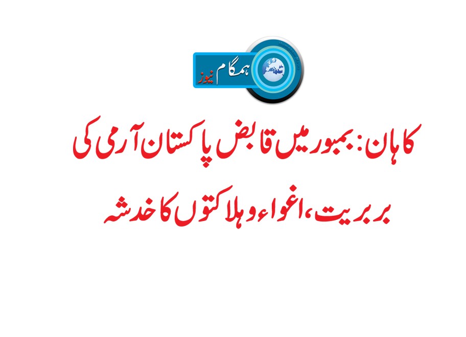 سبی ( ہمگام نیوز) کاہان ،قابض پاکستان آرمی کی بربریت، اغواء اور ہلاکتوں کا خدشہ،تفصیلات کے مطابق قابض پاکستان آرمی کی زمینی و فضائی فورسزکی جانب سے کاہان کے علاقے بمبور میں بربریت آج صبح سے جاری ہے ، جس میں کئی جگہوں پہ عام آبادیوں پہ یلغار کے دوران لوٹ مار اور گھروں کو جلانے کی اطلاعات کے علاوہ بلوچ فرزندوں کی قابض پاکستان آرمی کے ہاتھوں اغواء اور ہلاکتوں کا بھی خدشہ ظاہر کیا جارہا ہے، تازہ ترین علاقائی اطلاع کے مطابق صبح سے جاری بربریت شام تک جاری تھی اور مختلف مقامات پہ قابض آرمی نے علاقے کی ناکہ بندی کررکھی ہے ۔