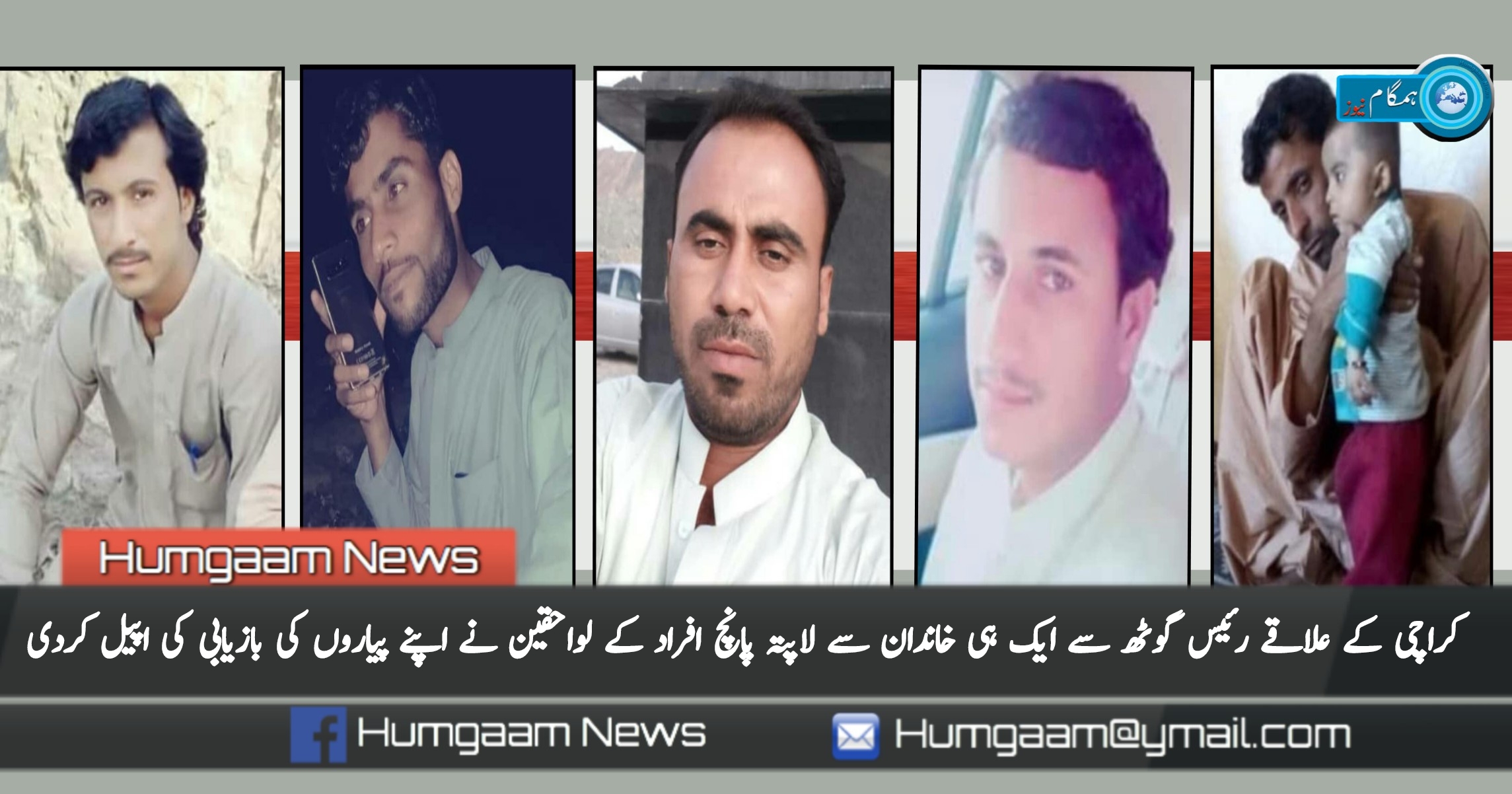 کوئٹہ (ہمگام نیوز) رئیس گوٹھ کراچی سے ایک ہی خاندان کے پانچ لاپتہ افراد کے لواحقین نے اپنے پیاروں کی بازیابی کی اپیل کرتے ہوئے کہا کہ ہمارے خاندان کے لاپتہ ہو جانیوالے پانچ افراد کو بازیاب کیا جائے۔