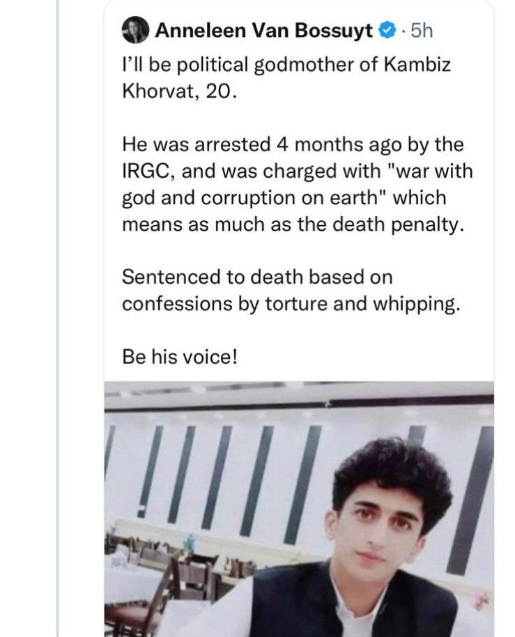 امسترڈم (ھمگام نیوز) نیدرلیند کی ممتاز رکن پارلمنٹ اور Nieuw-Vlaamse Alliantie (N-VA) پارٹی کا لیڈر محترمہ اینلین وان بوسویت نے ٹویٹر پر لکھی ہے کہ وہ 20 سالہ کمبیز خروت کی سیاسی گاڈ مدر (روحانی ماں) بنے گی۔ محترمہ اینلین جوکہ خود دو بچوں میٹیاس اور جیسمین کی ماں ہے، نے اپنی ٹویٹ میں لکھی ہے کہ کمبیز خروت کو 4 ماہ قبل IRGC نے گرفتار کیا تھا، اور اس پر “خدا کے ساتھ جنگ اور زمین پر بدعنوانی” کا الزام لگایا گیا ہے جس کا مطلب سزائے موت کے برابر ہے۔ تشدد اور کوڑے مار کر اعتراف جرم کی بنیاد پر موت کی سزا سنائی گئی۔ اس کی آواز بنو!