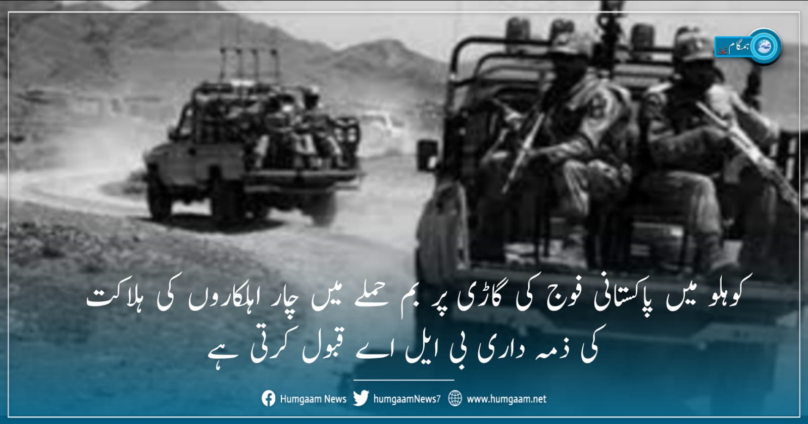 ہمارے سرمچاروں نے آج بروز جمعہ صبح نو بجے کوہلو کے علاقے نساو داو شاہ کے مقام پر ایک پاکستانی فوجی چوکی کے قریب قابض پاکستانی فوج کی پانی سپلائی کرنے والی ایک گاڑی کو بارودی سرنگ کے ذریعے نشانہ بنایا جس کی زد میں آکر گاڑی مکمل طور پر تباہ ہوگئی اور اس میں سوار چار اہلکار موقع پر ہلاک ہوگئے۔