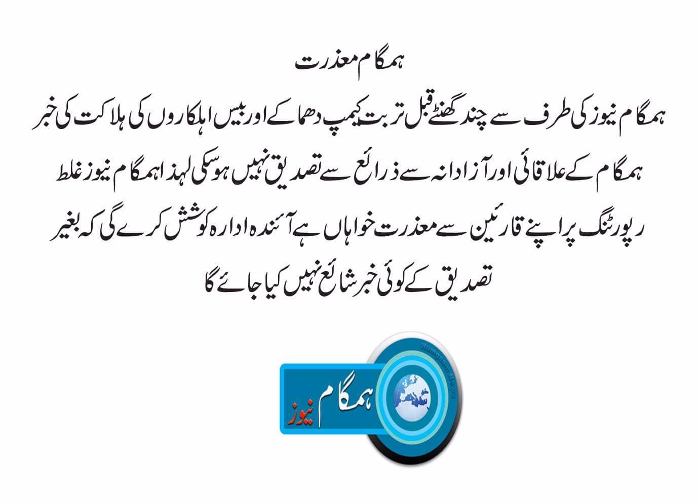 ہمگام نیوز کی طرف سے تین گھنٹے قبل تربت کیمپ دھماکے اور بیس اہلکاروں کی ہلاکت کی خبر ہمگام کےعلاقائ اور آزادانہ سے ذرائع سے تصدیق نہیں ہوسکی لحاظہ ہمگام نیوز غلط رپورٹنگ پر اپنے قارئین سے معذرت خواہاں ہے آئندہ ادارہ کوشش کرے گی کہ بغیر تصدیق کے کوئ خبر شائع نہیں کیا جائے گا ـ